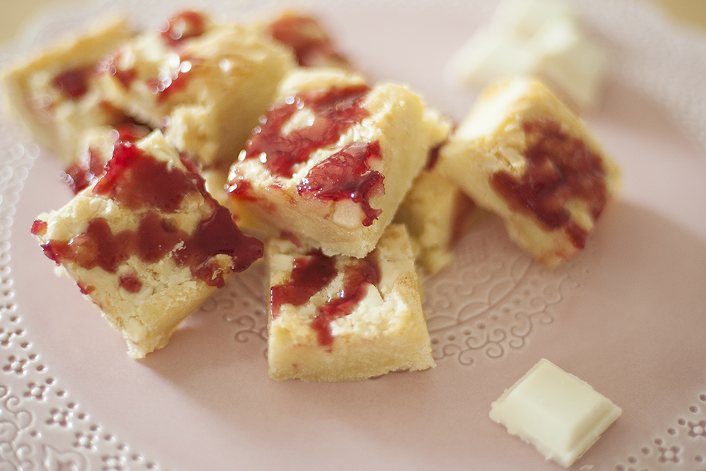Miniblondies med hallonsås