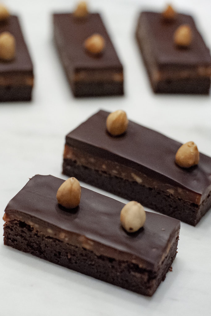 Brownie med hasselnötskola och mörk chokladganach