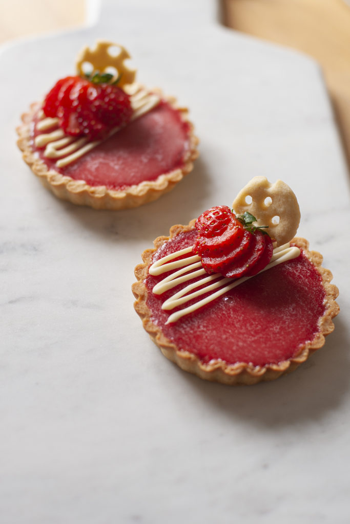 Mördegstartlett med kardemummapannacotta och jordgubb- och myntagelé