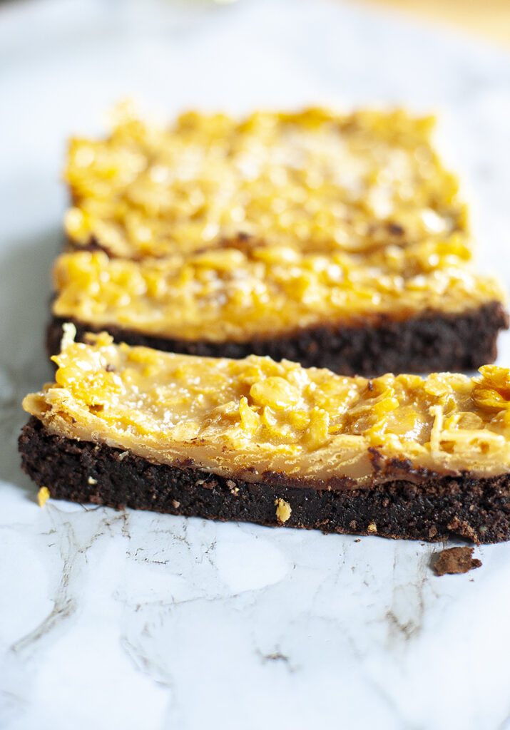 Glutenfri Brownie med smörkola- och cornflakestopping