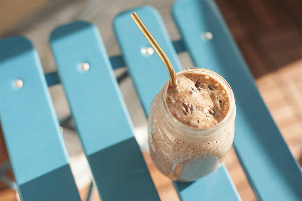 - Lägg alla ingredienserna i en mixer och mixa till en slät smoothies (när du tror att den är klar kan du köra ett par minuter extra för att verkligen få bort de sista klumparna och få lite extra skum).