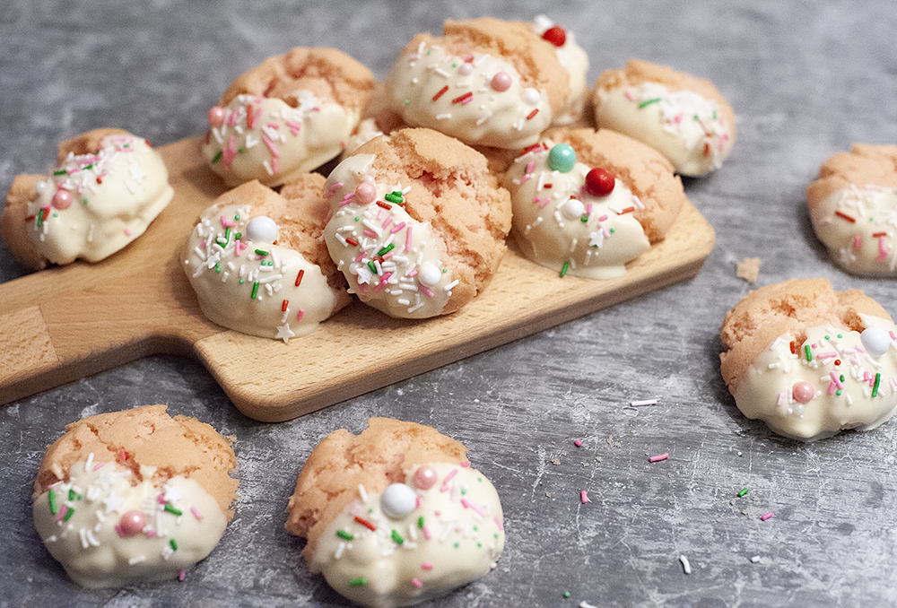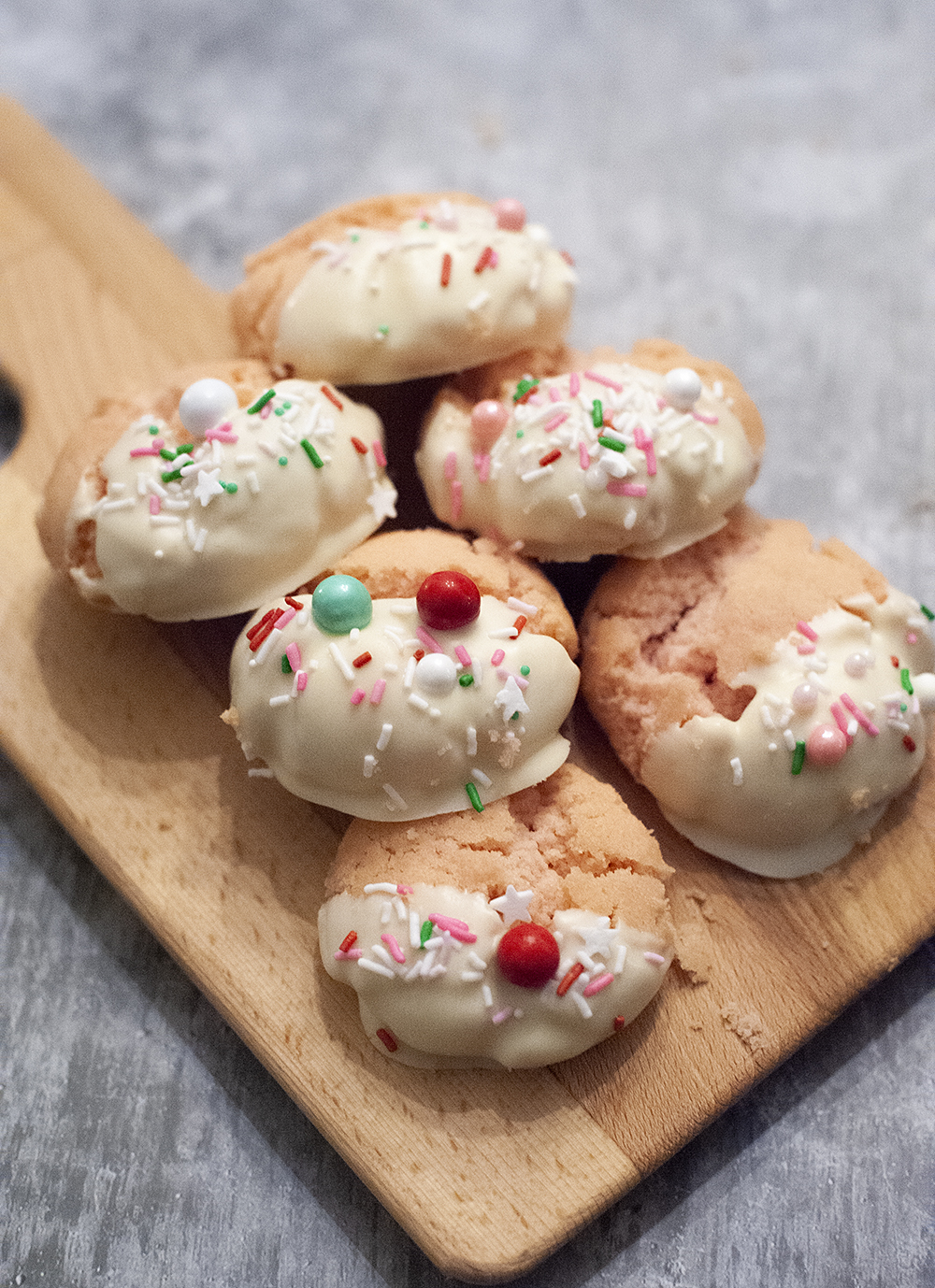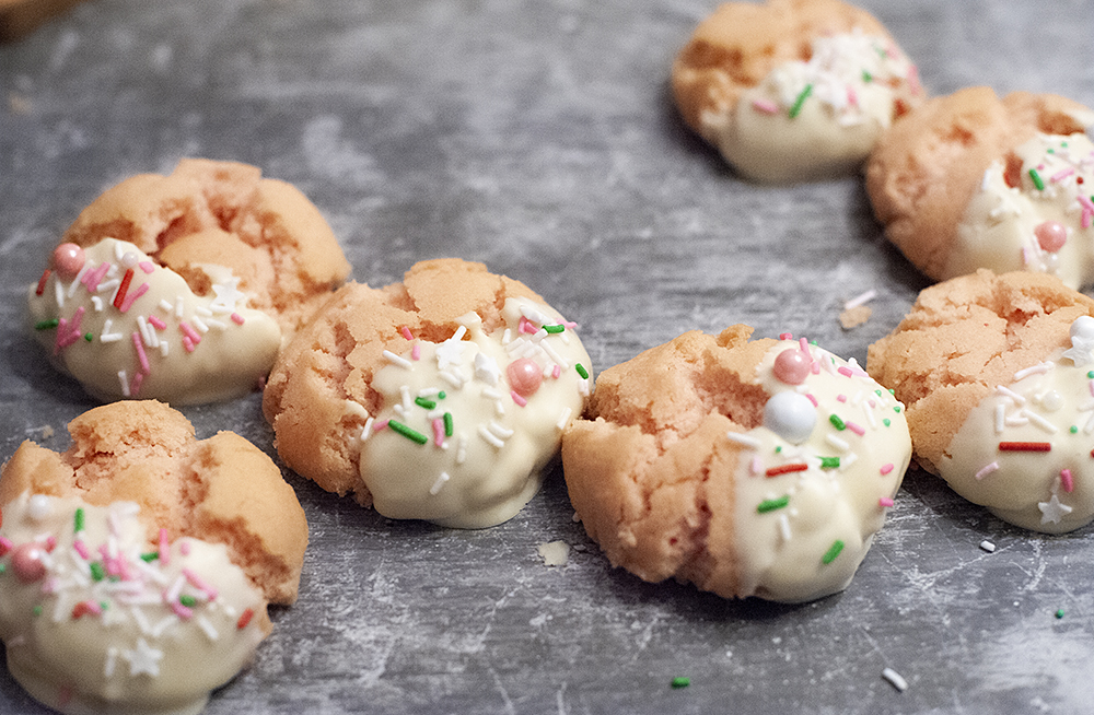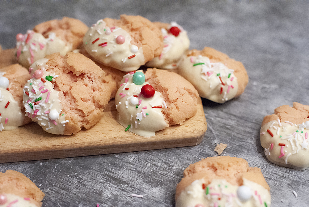 - Doppa kakorna i den vita chokladen och strö strössel på innan chokladen hunnit stelna.